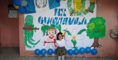 Niña declama frente a mural cívico que ella y su tía realizaron