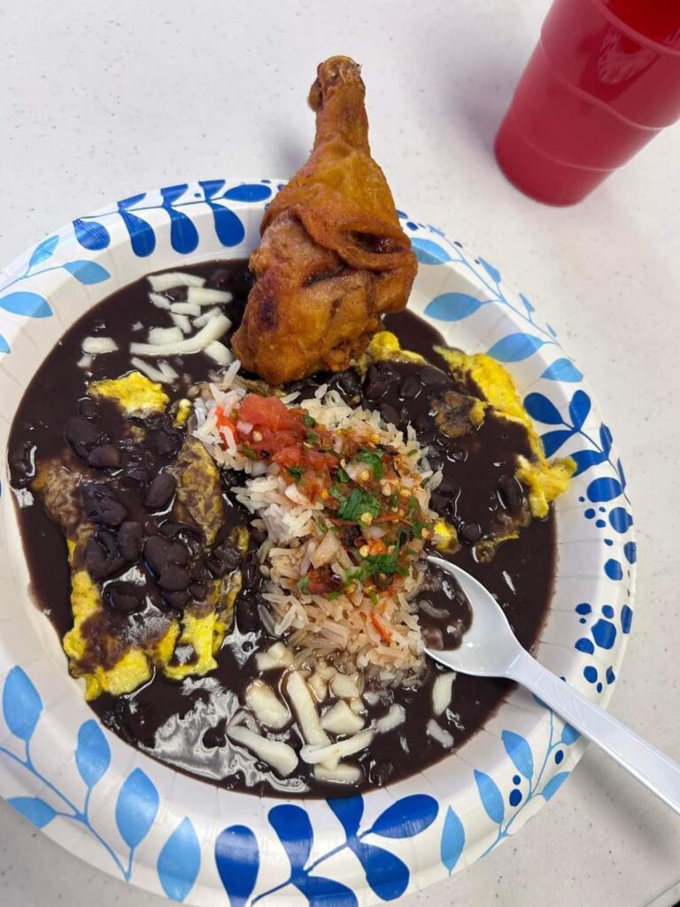 Acompañando al pollo, encontramos frijoles negros, un pilar de la dieta guatemalteca, presentados aquí en su versión más tradicional: enteros y bañados en su propio caldo, con un toque de huevo revuelto que añade una textura suave y un sabor extra. Al lado, un montón de arroz blanco es la base perfecta para recibir un generoso pico de gallo, ese fresco condimento de tomate, cebolla, cilantro y limón que aporta una explosión de frescura.