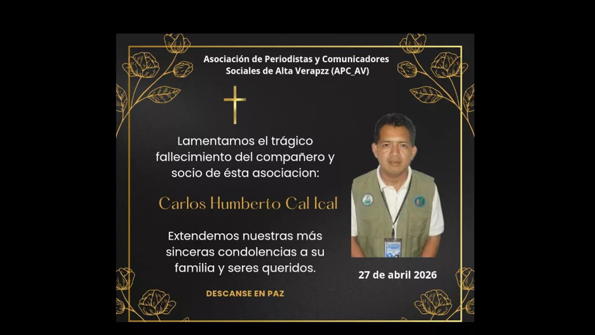El comunicador Carlos Humberto Cal Ical falleció este domingo 26 de abril de 2026 tras sufrir un ataque armado en San Cristóbal Verapaz, Alta Verapaz. La Asociación de Periodistas y Comunicadores Sociales de Alta Verapaz (APC-AV) confirmó el deceso y emitió un comunicado en el que exige justicia y una investigación exhaustiva.