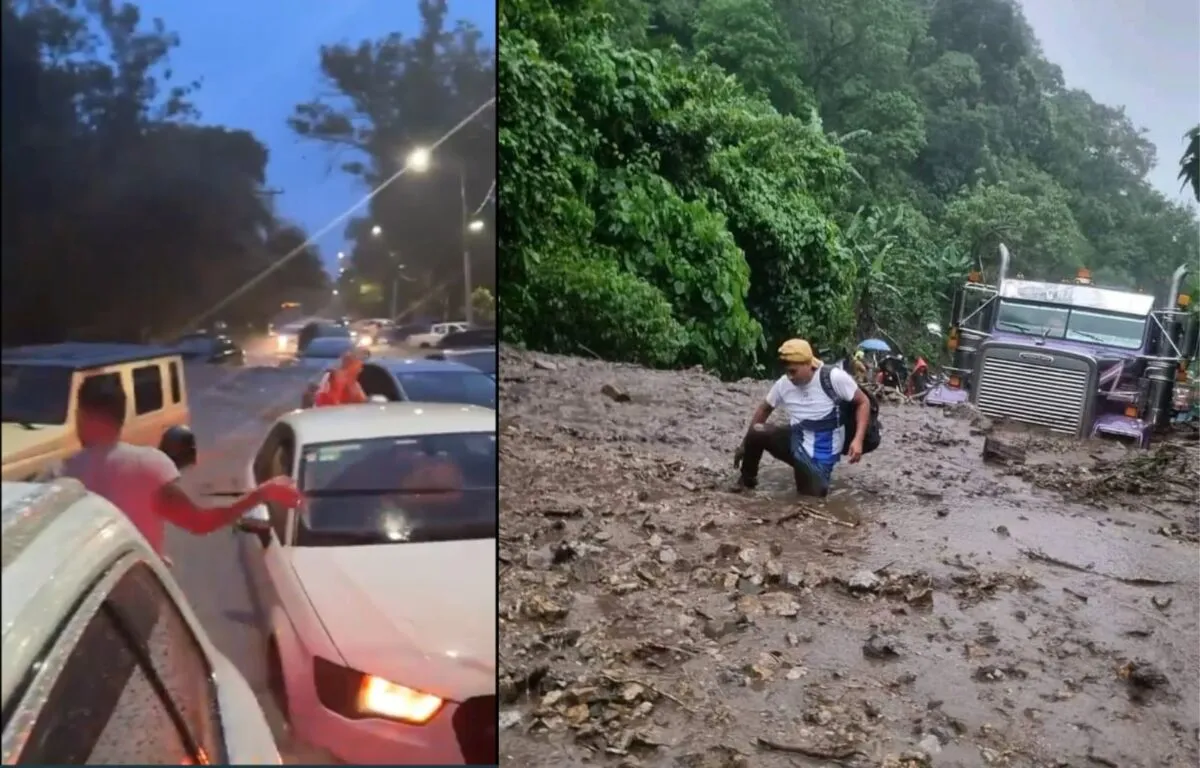 El desbordamiento de un río, acompañado de un gran flujo de lodo, piedras y árboles arrastrados por la corriente, cubrió gran parte de la carretera, poniendo en riesgo a conductores y transeúntes.