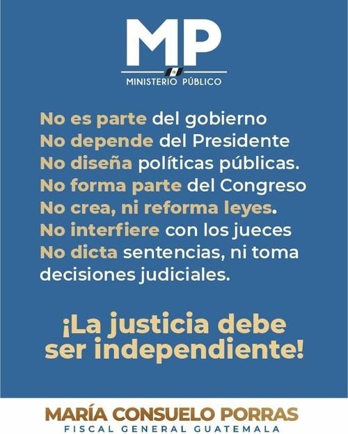En un contexto de creciente tensión entre el Ministerio Público (MP) y el Ejecutivo guatemalteco, la fiscal general Consuelo Porras ha emitido un mensaje claro y directo: "El MP no depende del Presidente". Esta declaración, difundida a través de las redes sociales oficiales del MP, subraya la autonomía e independencia de la institución frente a las presiones políticas.
