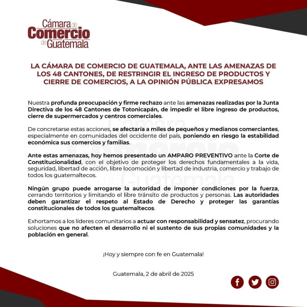 Ante el anuncio de estas medidas, la Cámara de Comercio de Guatemala expresó su profunda preocupación por el impacto que tales acciones podrían tener en la economía nacional, especialmente en los pequeños y medianos comerciantes.