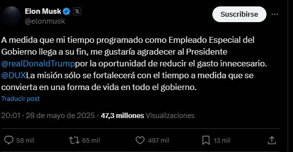 En un mensaje breve publicado en su cuenta de X (antes Twitter), Elon Musk expresó su agradecimiento al expresidente Trump por la oportunidad de colaborar en una iniciativa orientada a mejorar la eficiencia del Gobierno federal. Sin embargo, también dejó claro su descontento con la dirección que ha tomado la política fiscal actual.