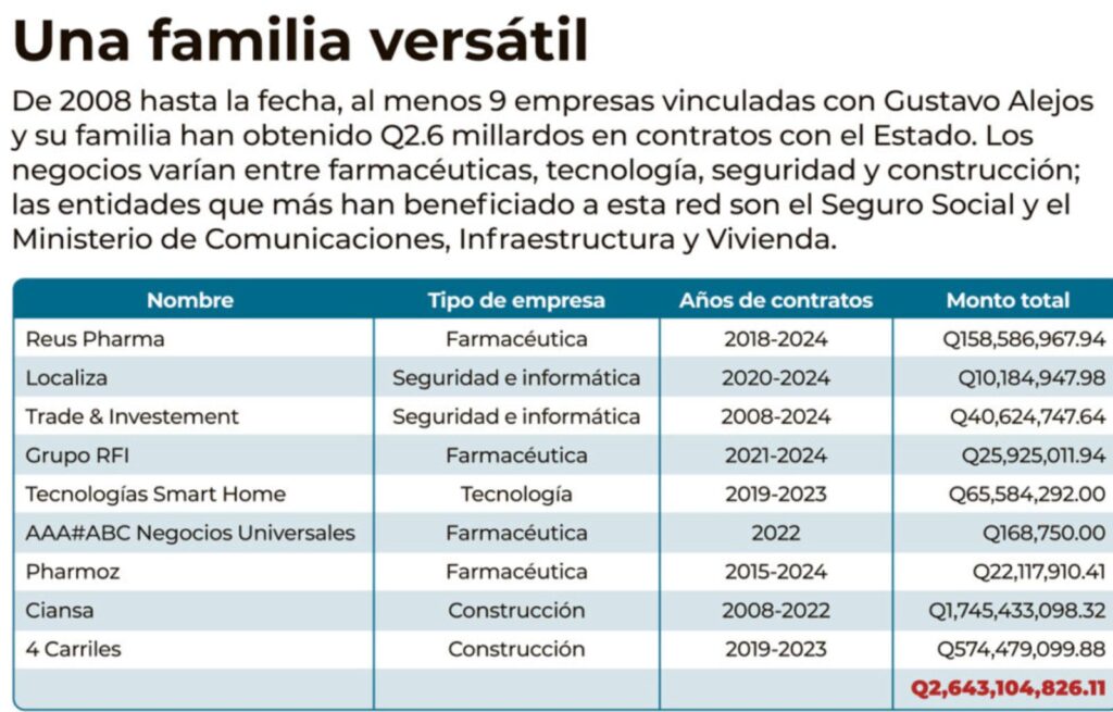 Las empresas administradas por los hermanos José Javier y Gustavo Andrés Alejos Jansa, herederos del exsecretario privado Gustavo Alejos Cámbara, han acumulado contratos por Q208 millones con diversas entidades públicas. Sumando otras sociedades vinculadas a la familia, la cifra total de contratos con el Estado alcanza los Q2.6 millardos. Entre las entidades más beneficiadas se encuentran el Instituto Guatemalteco de Seguridad Social (IGSS) y el Ministerio de Comunicaciones, Infraestructura y Vivienda (CIV).