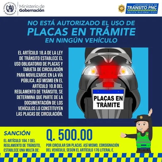 El Reglamento de Tránsito contempla una multa de Q500 por circular sin placas de circulación.