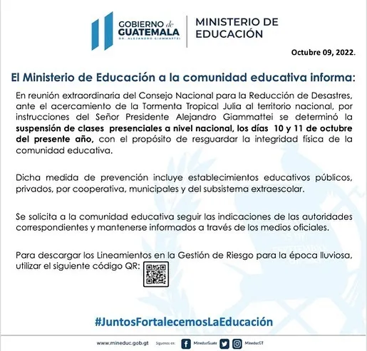 El Ministerio de Educación informó que por las fuertes lluvias de la tormenta Julia de suspender las clases del 10 al 11 de octubre para evitar la tormenta tropical Julia, siguiendo instrucciones del presidente Alejandro Giammattei.