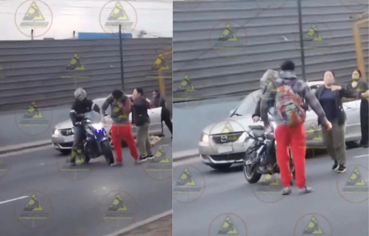 El incidente, que comenzó como una colisión entre una motocicleta y un vehículo particular, rápidamente se transformó en una violenta agresión física entre los involucrados. Las imágenes que circulan muestran el momento exacto en que dos motoristas, visiblemente alterados, hay un altercado con el conductor del automóvil, mientras una mujer que viajaba como copiloto interviene de forma inesperada para protegerlo utilizando un aerosol defensivo.