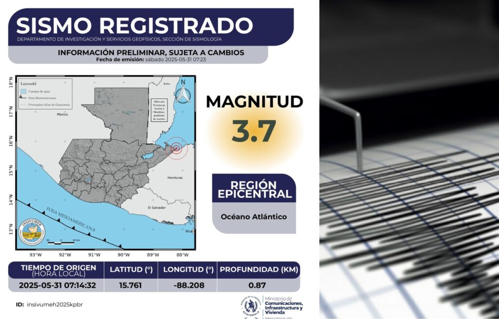 Un sismo de magnitud 3.7 en la escala de Richter se registró este sábado 31 de mayo de 2025, a las 7:14 horas, frente a las costas del Océano Atlántico, en las inmediaciones del departamento de Izabal, según informó el Instituto Nacional de Sismología, Vulcanología, Meteorología e Hidrología (Insivumeh). El temblor, aunque leve, es un recordatorio importante sobre la vulnerabilidad sísmica de Guatemala y la necesidad de mantener protocolos de prevención y reacción actualizados entre la población.